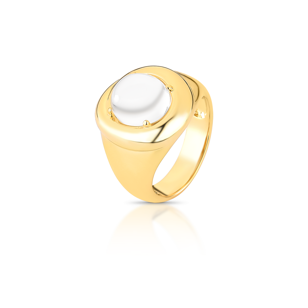 Anel com cristal cabochão, banhado a ouro, criado artesanalmente e finalizado à mão. O design valoriza a transparência do cristal e o brilho sofisticado do ouro, resultando em uma peça elegante, sutil e atemporal.
