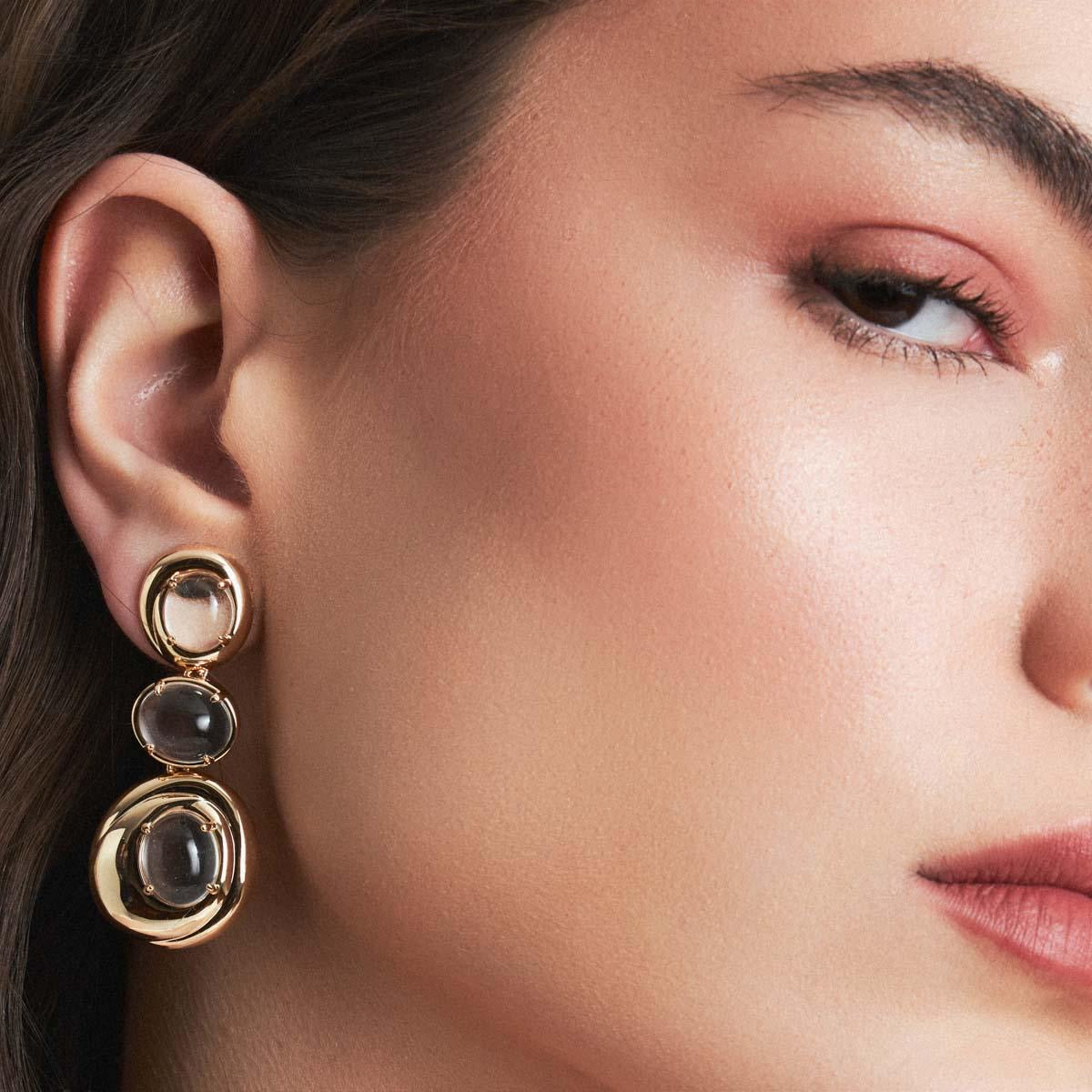 Brinco pêndulo com cristal cabochão oval, banhado a ouro, criado artesanalmente e finalizado à mão. O design valoriza a transparência do cristal e o brilho sofisticado do ouro, resultando em uma peça elegante, sutil e atemporal.